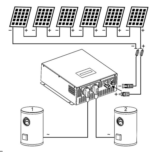 Pozwala to na podłączenie dwóch urządzeń grzewczych np. dwóch bojlerów, z których jeden będzie nagrzewany jako pierwszy, a drugi w sytuacji gdy termostat tego pierwszego przerwie odbieranie energii z przetwornicy. Dzięki zaimplementowanej funkcji MPPT, przetwornica automatycznie przystosuje się do mocy grzałki i tak ustawi swój punkt pracy, aby energia odbierana z systemu paneli fotowoltaicznych była maksymalna.
