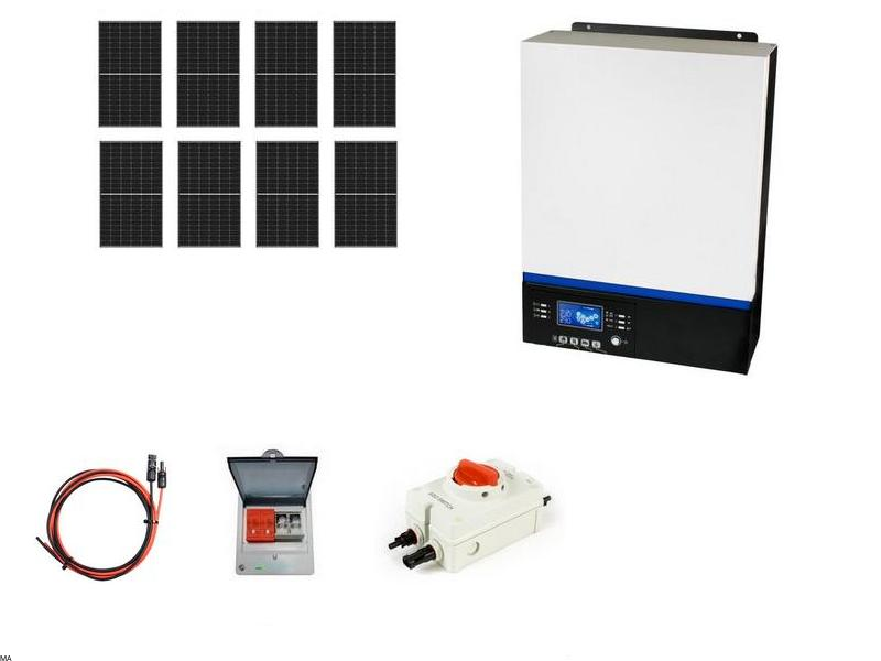 Zestaw składa się z 8 paneli monokrystalicznych o mocy 430W każdy, inwertera hybrydowego ESB-6kW-24, zabezpieczenia DC/DC, rozłącznika izolacyjnego oraz kompletnego okablowania o długości 25 metrów zakończonego złączami MC4.