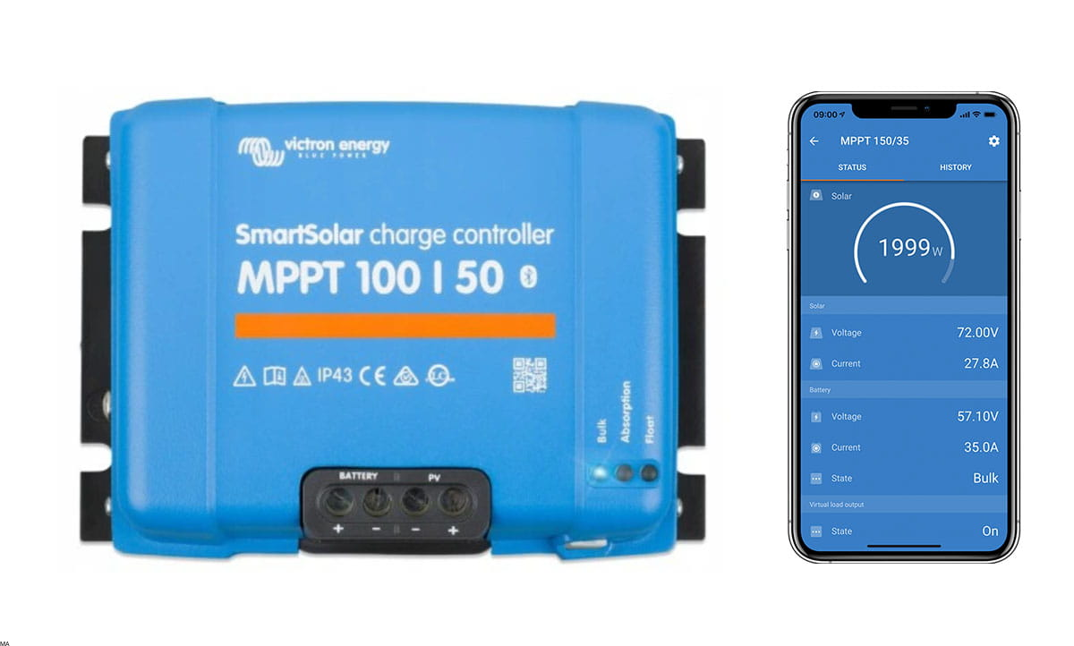 SmartSolar 100/50 ma wbudowany moduł Bluetooth, dzięki czemu wszystkie parametry są pod ręką w aplikacji VictronConnect. Na telefonie sprawdzisz bieżący prąd ładowania, historię produkcji z paneli, napięcie akumulatora, a także wygodnie zmienisz ustawienia ładowania pod konkretny typ baterii, czy to AGM, żel, klasyczny kwasowo ołowiowy, czy litowy, w tym LiFePO4. To szczególnie przydatne przy nowoczesnych bankach energii w kamperach i busach przerobionych na dom na kołach.